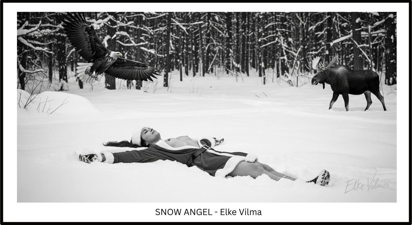 As the moose disappears back into the woods, its antlers scraping low branches, Cassie returns to her angel making, the repetitious motion of her arms and legs deepening her body’s imprint in the snow.