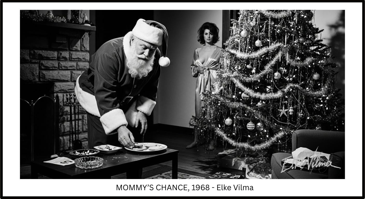 His back is to her as Sara steps into the living room, opens her robe, and is about to say, “If you want to fuck me…” But she hesitates, the words caught in her throat, trapped by her inhibitions, and before she can bring herself to say aloud what she wants, he was back up the chimney, avoiding hot coals as magically as he’d come down…