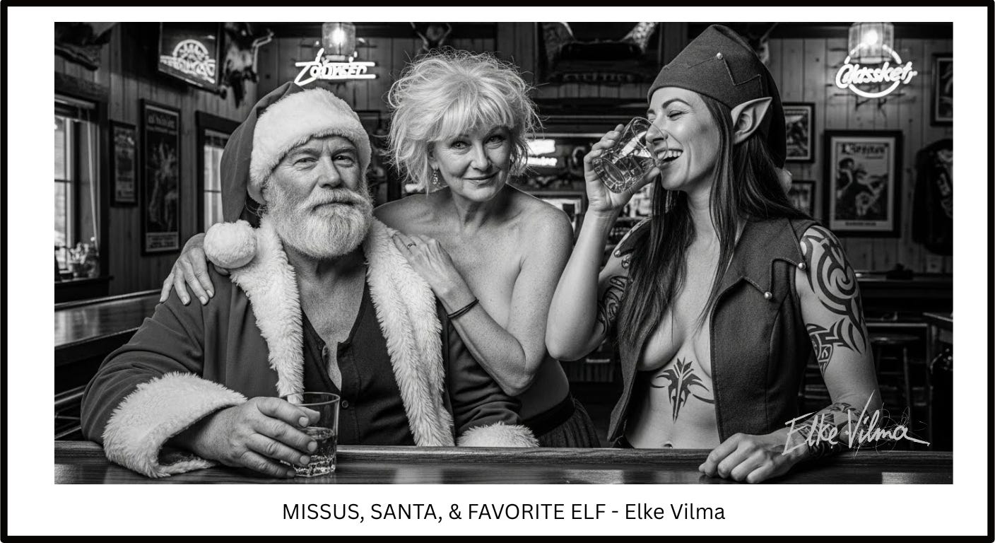 Santa sits at the long bar built against one wall, his trademark red jacket unbuttoned. He sips whiskey which gives him a satisfied glow after another Christmas magically accomplished. He greets Analee in his deep, powerful voice, calling her by name.